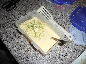 The weather plays a crucial part in it; a fine, dry day is best. As you can see in the picture, we were not entirely lucky that day. It had been raining right up to the moment we arrived in the garden (it is an allotment about half an hour by car from the town where we live), and so the flowers were wet - they shouldn't be, and you should not wash them if you happen to catch a sunny day for your elderflower pancake fest!
